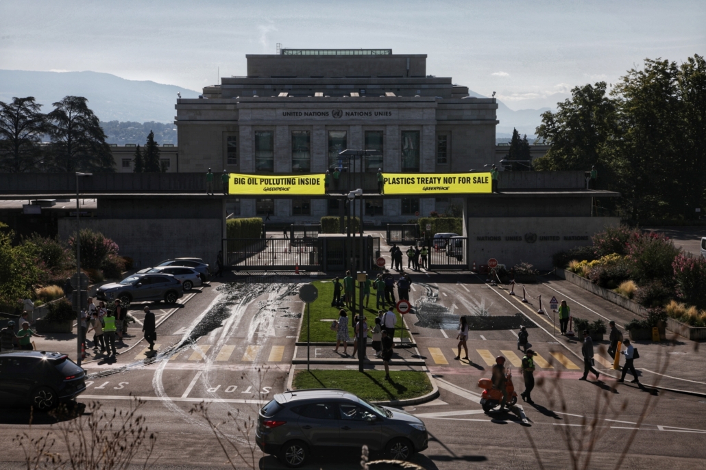 Greenpeace-Aktivist:innen bemalten StraรŸen von Genf schwarz, um mit dieser symbolischen ร–lspur auf den unangemessenen Einfluss der fossilen Brennstoffindustrie auf die Verhandlungen aufmerksam zu machen. Mit dieser Aktion und riesigen Bannern รผber dem Eingang zum Palais des Nations fordern sie die UNO auf, Lobbyvertreter:innen der fossilen Brennstoffindustrie auszuschlieรŸen.