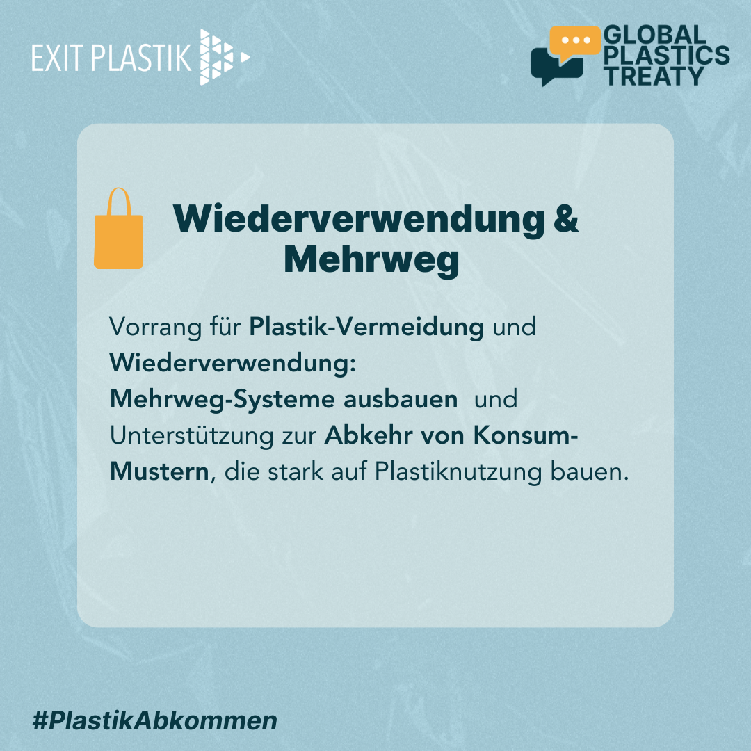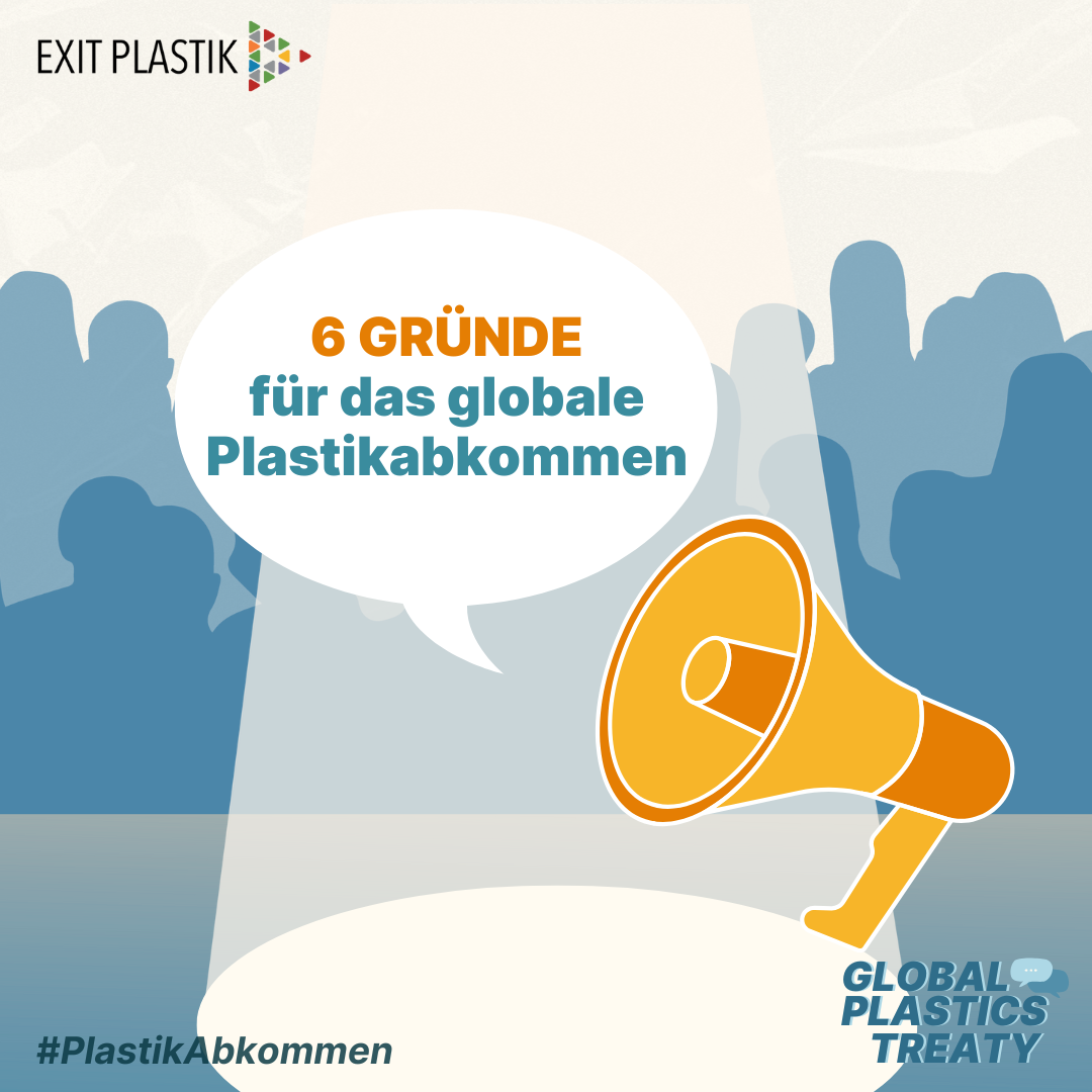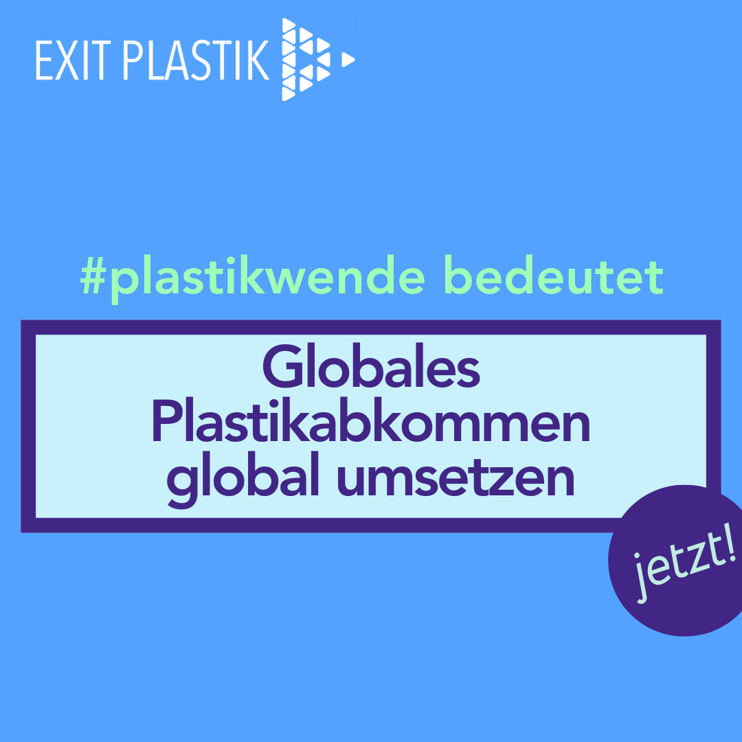 Um die anhaltende Bedrohung der Gesundheit von Mensch, Tier und Umwelt durch Plastik zu beenden, brauchen wir ein verbindliches globales Plastikabkommen. Ein solches neues globales Abkommen muss den gesamten Lebenszyklus von Plastik umfassen, einschließlich der Rohstoffgewinnung, der Produktion, des Transports, der Nutzung, der Entsorgung und der Sanierung. Insbesondere gilt es die Plastikproduktion zu verringern und gefährliche Chemikalien in Plastik zu verbieten.