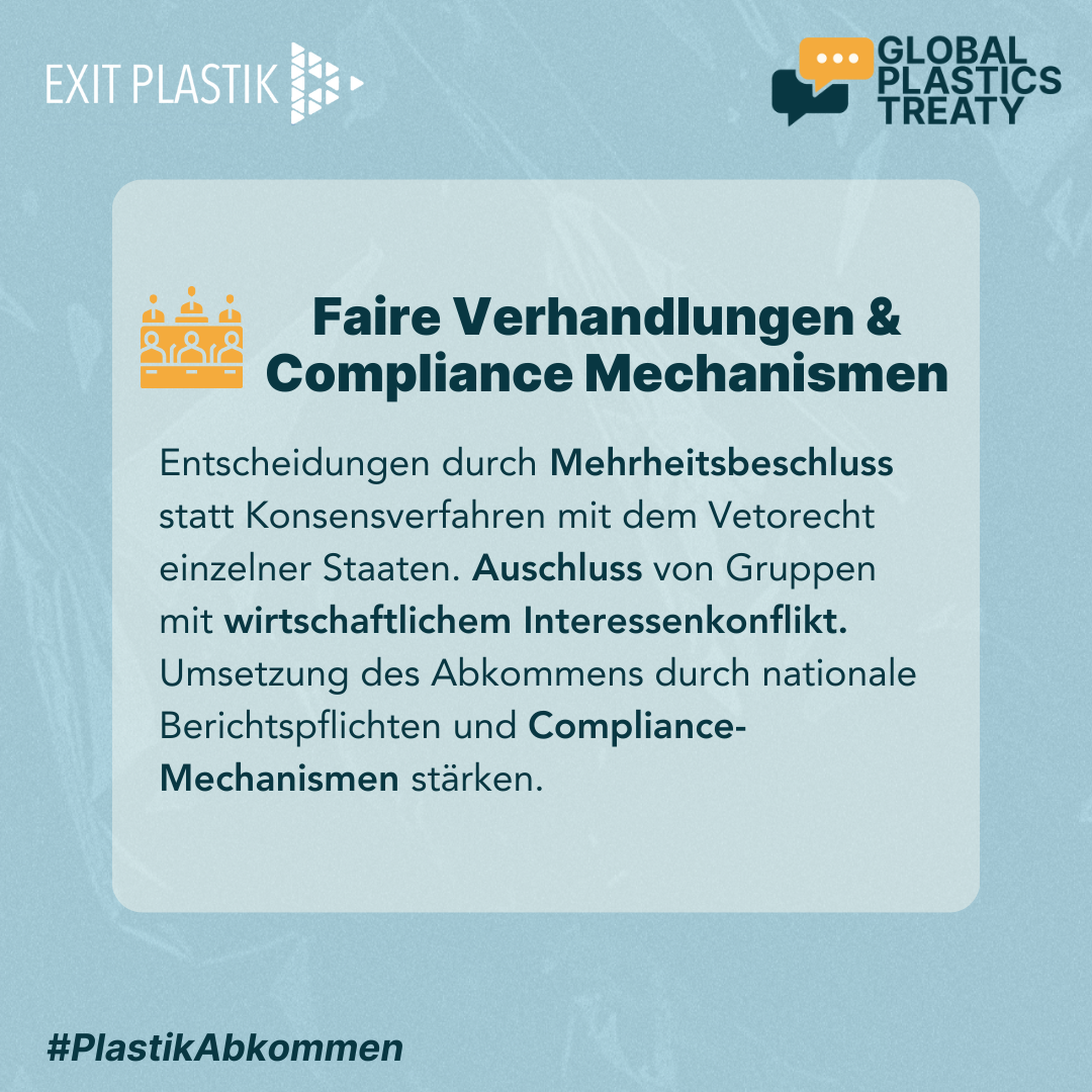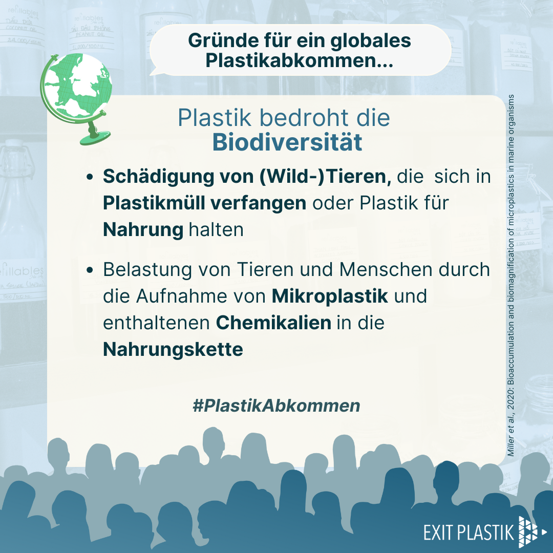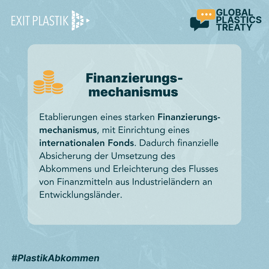 Um die anhaltende Bedrohung der Gesundheit von Mensch, Tier und Umwelt durch Plastik zu beenden, brauchen wir ein verbindliches globales Plastikabkommen. Ein solches neues globales Abkommen muss den gesamten Lebenszyklus von Plastik umfassen, einschließlich der Rohstoffgewinnung, der Produktion, des Transports, der Nutzung, der Entsorgung und der Sanierung. Insbesondere gilt es die Plastikproduktion zu verringern und gefährliche Chemikalien in Plastik zu verbieten.