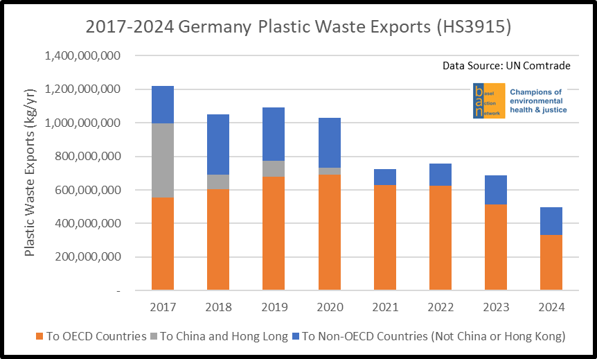 Mit 5,58 Millionen Tonnen im Jahr 2023 gehört Deutschland zu den Industrieländern, die besonders viel Kunststoffabfall erzeugen – nicht verwunderlich, bei einem Jahreskunststoffverbrauch von 11,25 Millionen Tonnen. So war Deutschland 2023 auch mit knapp 700.000 Tonnen der größte Exporteur von Plastikmüll in der EU. Die größte Menge wurde dabei in die Niederlande exportiert (zweitgrößter EU-Plastikmüllexporteur, mit großem Umschlaghafen in Rotterdam), gefolgt von Malaysia, der Türkei und Polen. Zu den Nicht-OECD-Ländern die besonders viel Plastikmüll aus Deutschland erhielten, gehörten auch Indonesien und Vietnam.