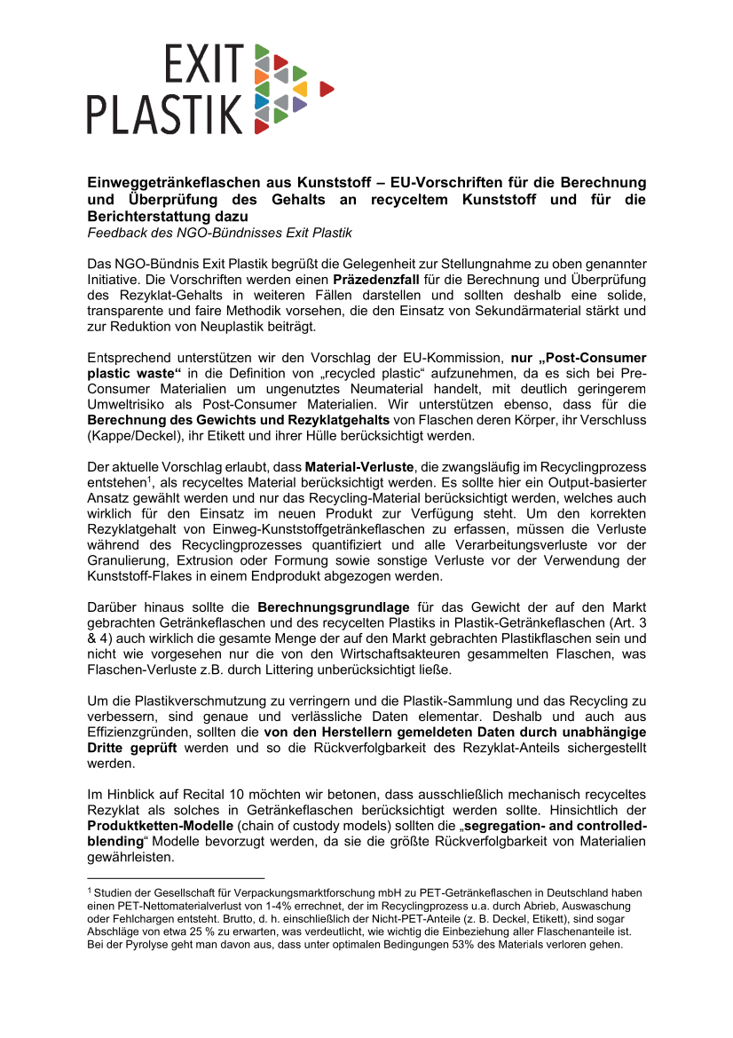 Feedback zur EU-Initiative zur Berechnung und Überprüfung des Rezyklat-Gehalts in Einwegplastikflaschen