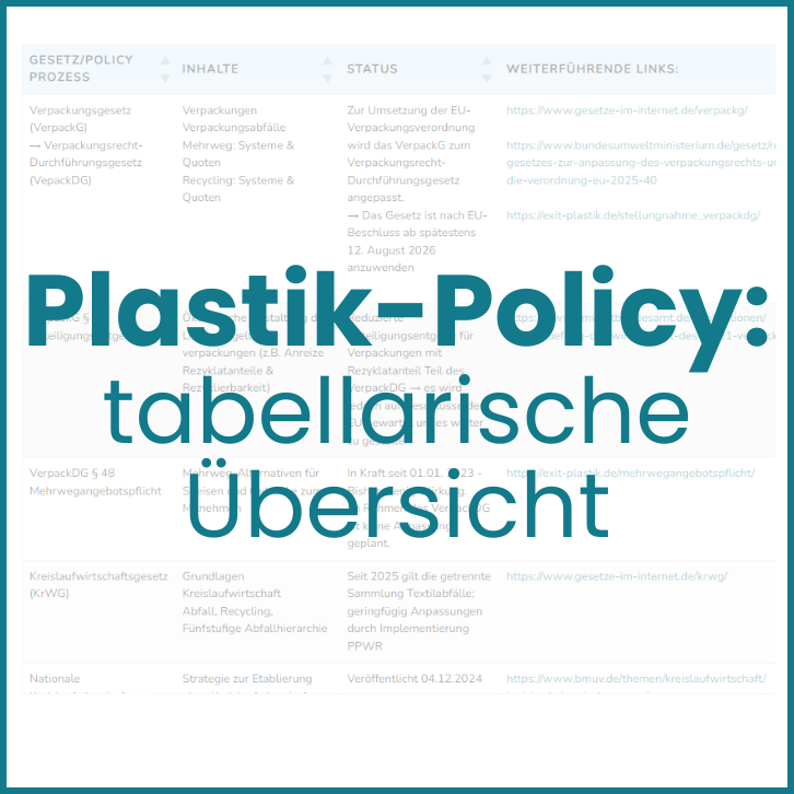 Tabellarischer Überblick über Gesetze, Regelungen und Strategien in Deutschland, der EU und global, die relevant für Plastik und unsere Arbeit als Bündnis sind.